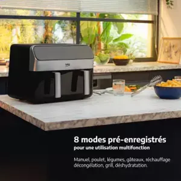 Programmes automatiques : 9 modes de cuisson prédéfinis (AirFry, grill, rôtir, décongeler, déshydrater, maintenir au chaud, etc.).